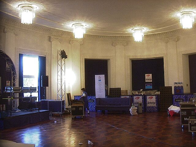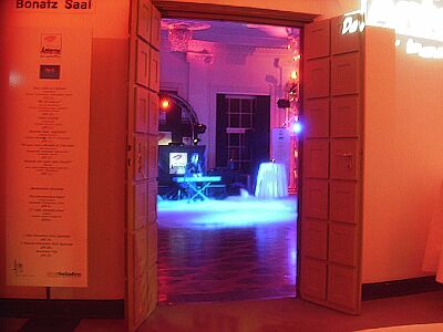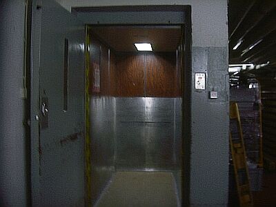 | Der Ladeweg dahin ist müßig. Entladen beim Küchenlager, rechts dieses Mini-Fahrstuhls ca 15. entlang, durch dieses AntikStück (nix Truss, nix Genies) falls der Fahrstuhl nicht gerade kaputt ist oder von der Gastro belegt, dann noch 35m zum Saal. | ![]() |